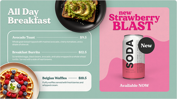 Upload your video media as backgrounds or easily animate elements with our key framing tools to create more dynamic menu boards.